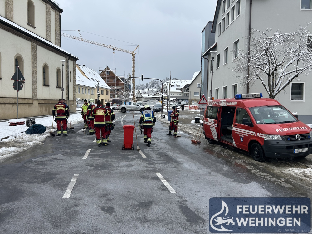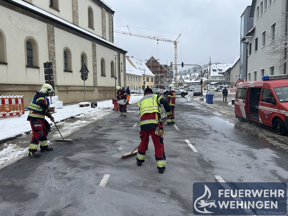 Einsatz für die diensthabende Kleineinsatzgruppe am heutigen Morgen. Mit dem Einsatzstichwort „Ölspur – Feuerwehr notwendig“ wurden wir vom Bauhof Wehingen nachgefordert. Im Bereich des Rathauses kam es zu einem kleineren Verkehrsunfall und in dessen Folge zu einer großflächigen Verschmutzung der Fahrbahn über ca. 150 Meter.