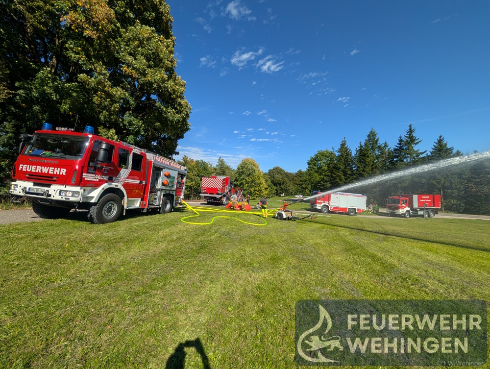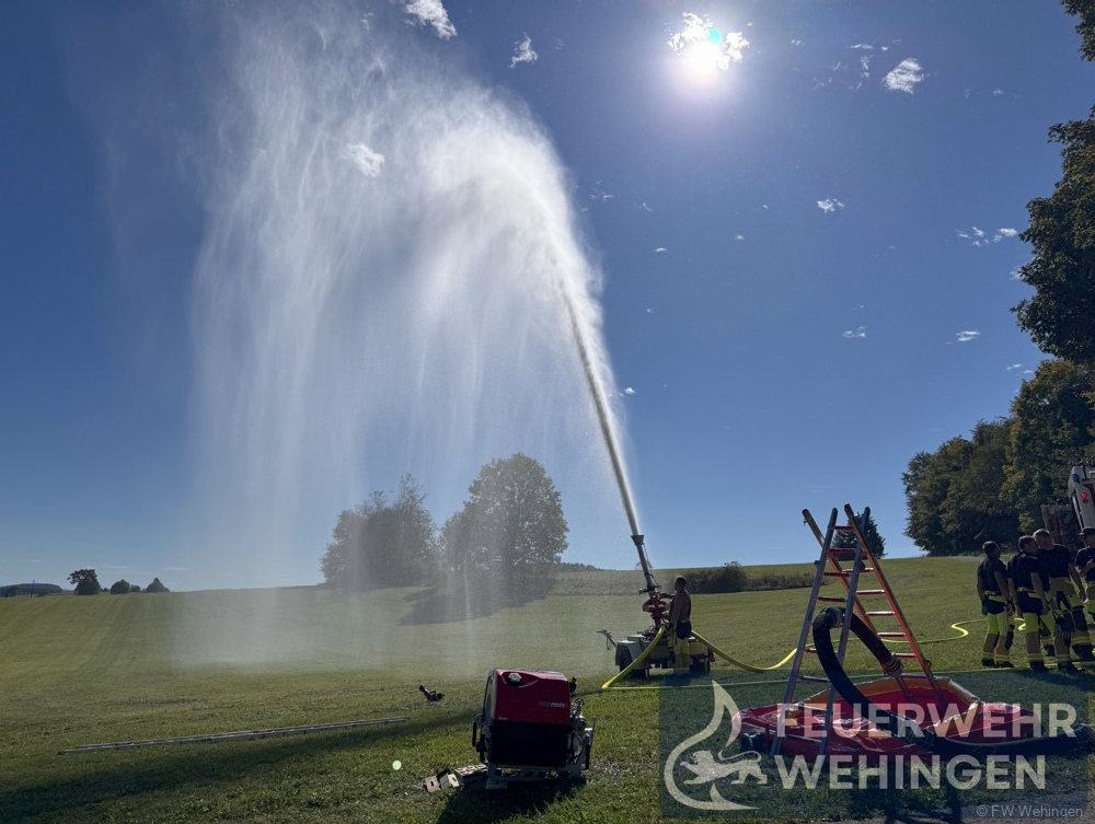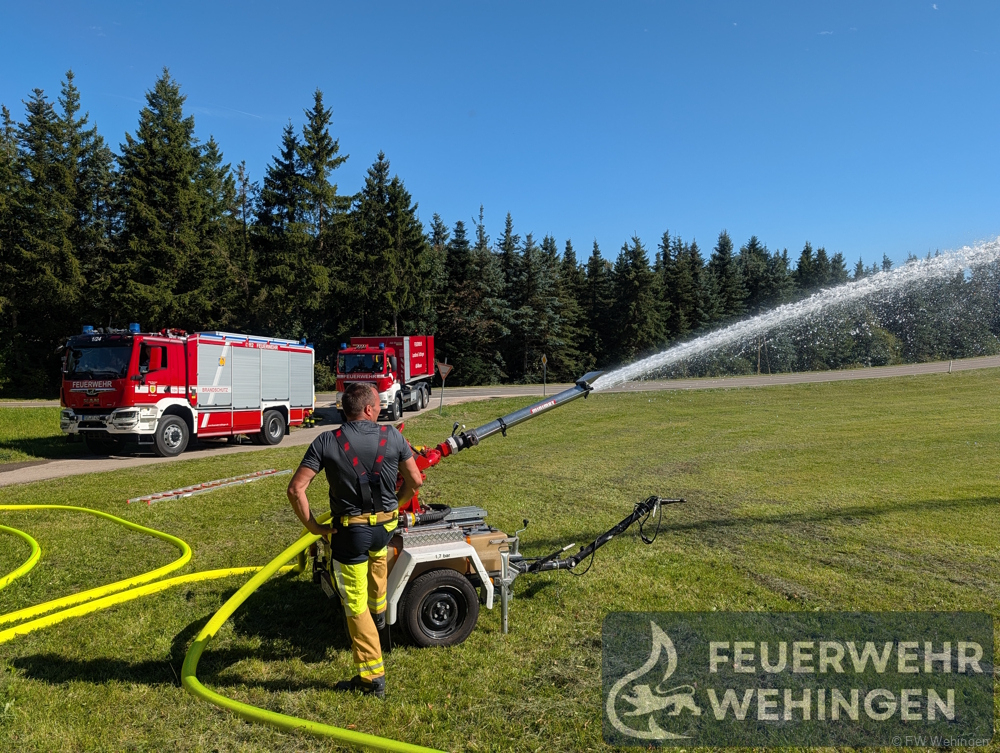 Unsere Aufgabe bei der gestrigen Übung war es, das bereitgestellte Wasser zu verwerten und somit eine Einsatzstelle zu simulieren. Mit unserem Schaum-Wasser-Werfer verbrauchten wir zu Spitzenzeiten 1.600 Liter Wasser pro Minute. Der IKZ sorgte für die Wasserversorgung zwischen einem Hydranten in Bubsheim und der fiktiven Einsatzstelle im Bereich der Wehinger Skihütte.